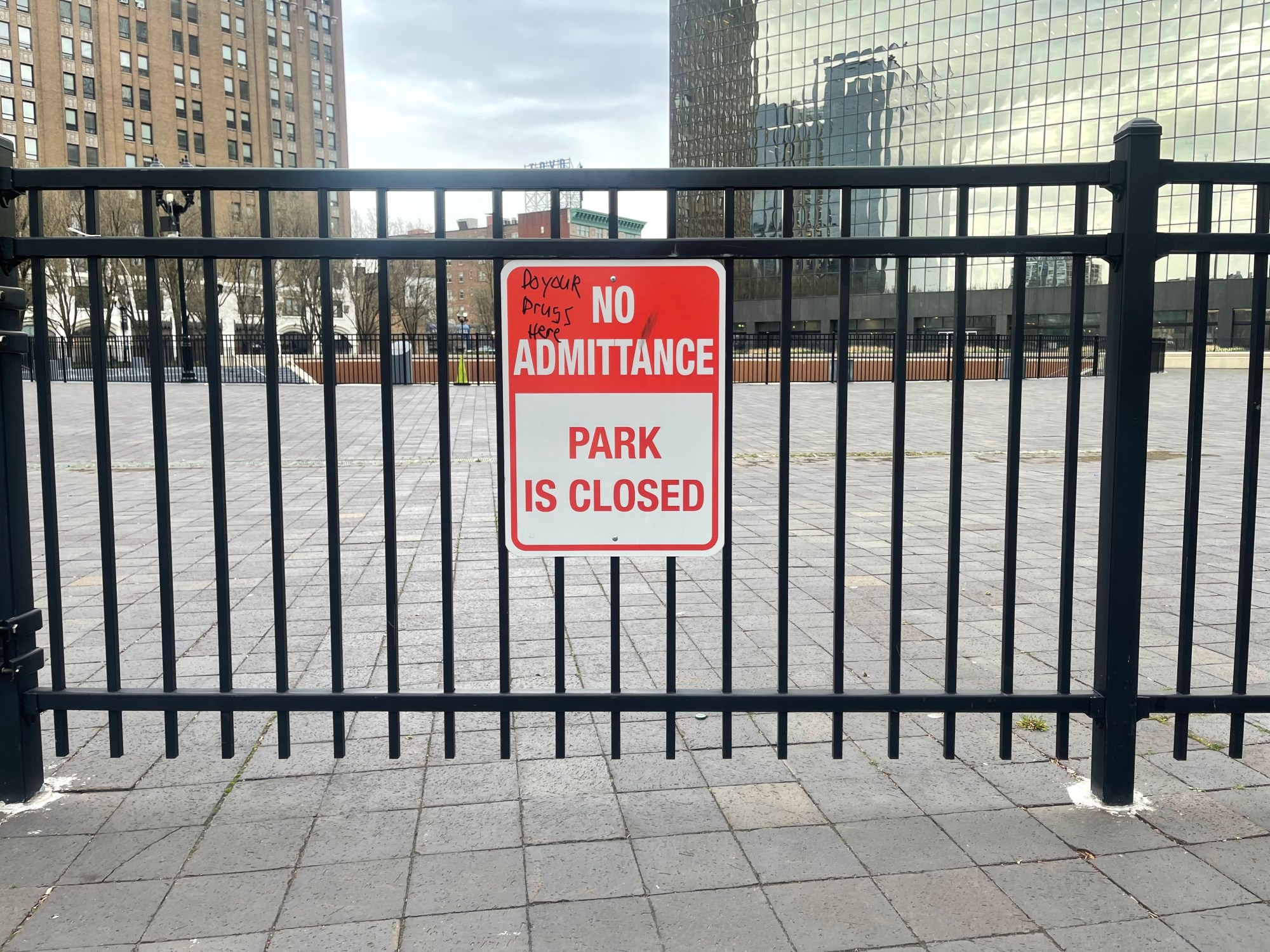 Enclosure of public spaces in Newark is a long running problem, but one that has extra resonance at this moment. The first example that comes to mind for many Newarkers is PSE&G Plaza on Park Place. For decades, the plaza was a makeshift forum for the residents and workers downtown. People would eat their lunch within sight of the flowing fountain and overgrown ivy. Community groups could use the amphitheater to hold meetings in the hundreds. (I know this, because I too used that space to hold meetings of that size.) On the weekends, you would inevitably find teenagers improvising the space as a skate park. Then, suddenly, right when Prudential purchased the plaza from the energy behemoth in 2018, the gates shut and access was limited to a paltry few hours when the Downtown District would hold a market on Thursdays in the summers. As if that were not enough, an interior fence was placed around the amphitheater, doubly cutting off access. Our only enjoyment of the space now comes from looking at it from the public sidewalk or the few hours we get during market hours once a week.