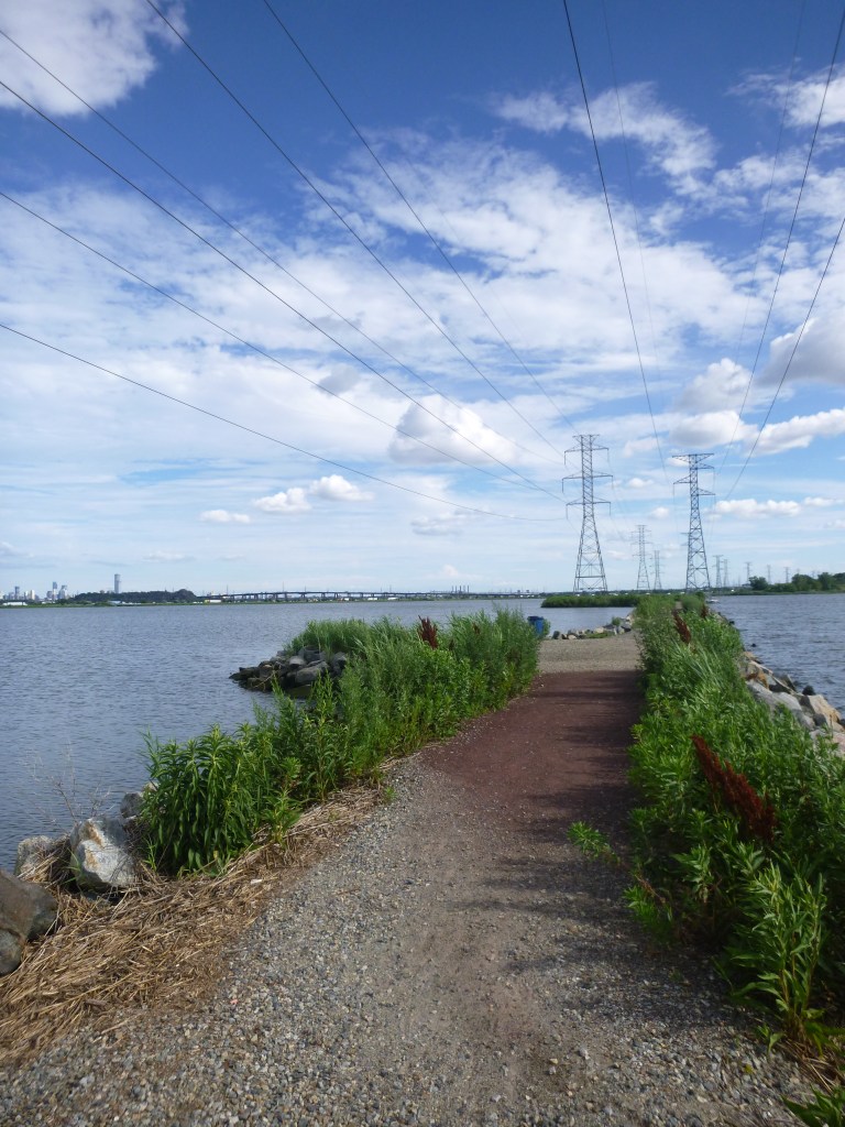 This was not a nature hike in the way one through the Pinelands or northwestern mountains might be. Only yards from congregating birds and the quiet whisper of a breeze through seven-foot grass were trucks speeding across the turnpike. Beyond signs warning of toxic fish swimming in innocuous looking pools, the Newark and Manhattan skylines loomed silently. Rusted railroad bridges and the remnants of wooden fortifications lay scattered across the landscape. A serene grass-covered hill was actually a repurposed landfill, and many paths into the water had originated as access points to massive rows of power lines.