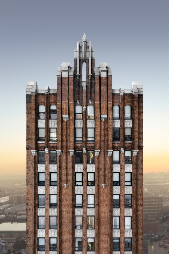 Hytha: To get these clear unobstructed orthogonal views of the buildings, I use a drone. The images are composited from 5–10 images taken while flying up the facade, which yields a high-resolution, flattened perspective image. I am an FAA-licensed drone pilot and coordinated with the Newark airport tower to plan my drone flights.