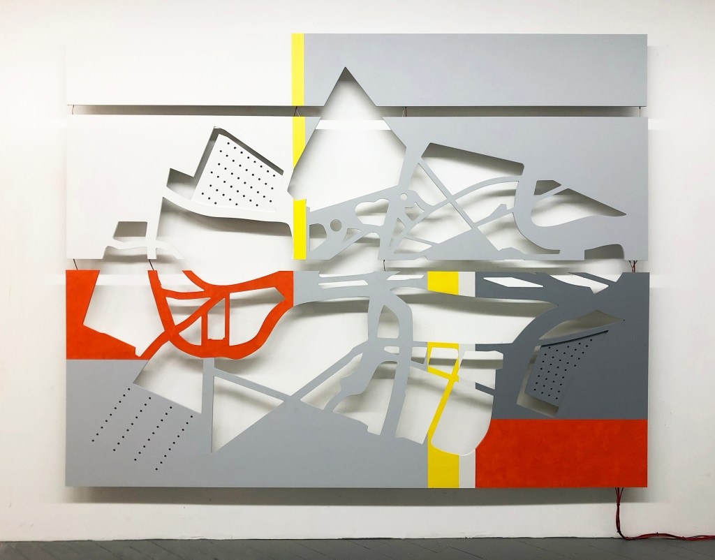 Steve Rossi, currently an artist-in-residence at Gallery Aferro, is a versatile sculptor finding inspiration in all sorts of materials such as altered View Master toys, Fruit Loops cereal and chewing gum found on urban sidewalks. In his latest artistic foray, he moves into the digital realm with “Rivers, Blocks, and Bridges to Newark Bay,” an installation fabricated from CNC routed wood paired with LED lights sequenced through Arduino using tweaked open-source code. The wall mounted installation faces outward on Market Street, luring viewers by day with its bold orange and yellow palette—a reference to road signage.