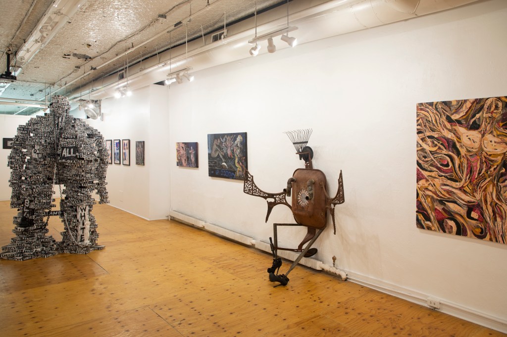 The show opens with the uneasy domesticity of a constructed suburban life as depicted by Christine Sauerteig-Pilaar whose mixed media impressions of the female body convey a frustration with expectations women were taught to place on themselves or were placed on them by others. “Disintegration #5” incorporates sewing patterns against deconstructed imagery of female bodies and draped fabric that dissolve into topographical and anatomical depictions. Hung from a drapery rod, the piece is constructed by layers of paper and cloth that hang limply from the top before terminating in a pseudo bridal dress train that rests on the floor. The delicate and haunting take on domesticity is accentuated by the subtle palette that quietly and decorously waits acknowledgement by the viewer.