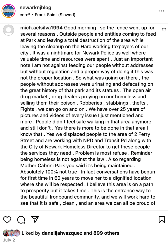 The reaction on social media and community forums evinced a mixture of shock, outrage, and confusion. Perhaps the most popular and discussed post came from the Instagram account @newarknjblog, which has over 25,000 followers.2 The post consisted of a drone shot over the park that fully encompasses the fencing around the park and had over 890 likes and over 240 comments and replies at the end of July. The comments were largely critical and included descriptors like “fucking despicable,” “not cool,” and “completely fucking stupid.” Most notably, there was a comment from @mich.aelsilva1994 saying that the park was a “nightmare” for Newark police, functioned as an “open air drug market,” and that “people didn’t feel safe.”
